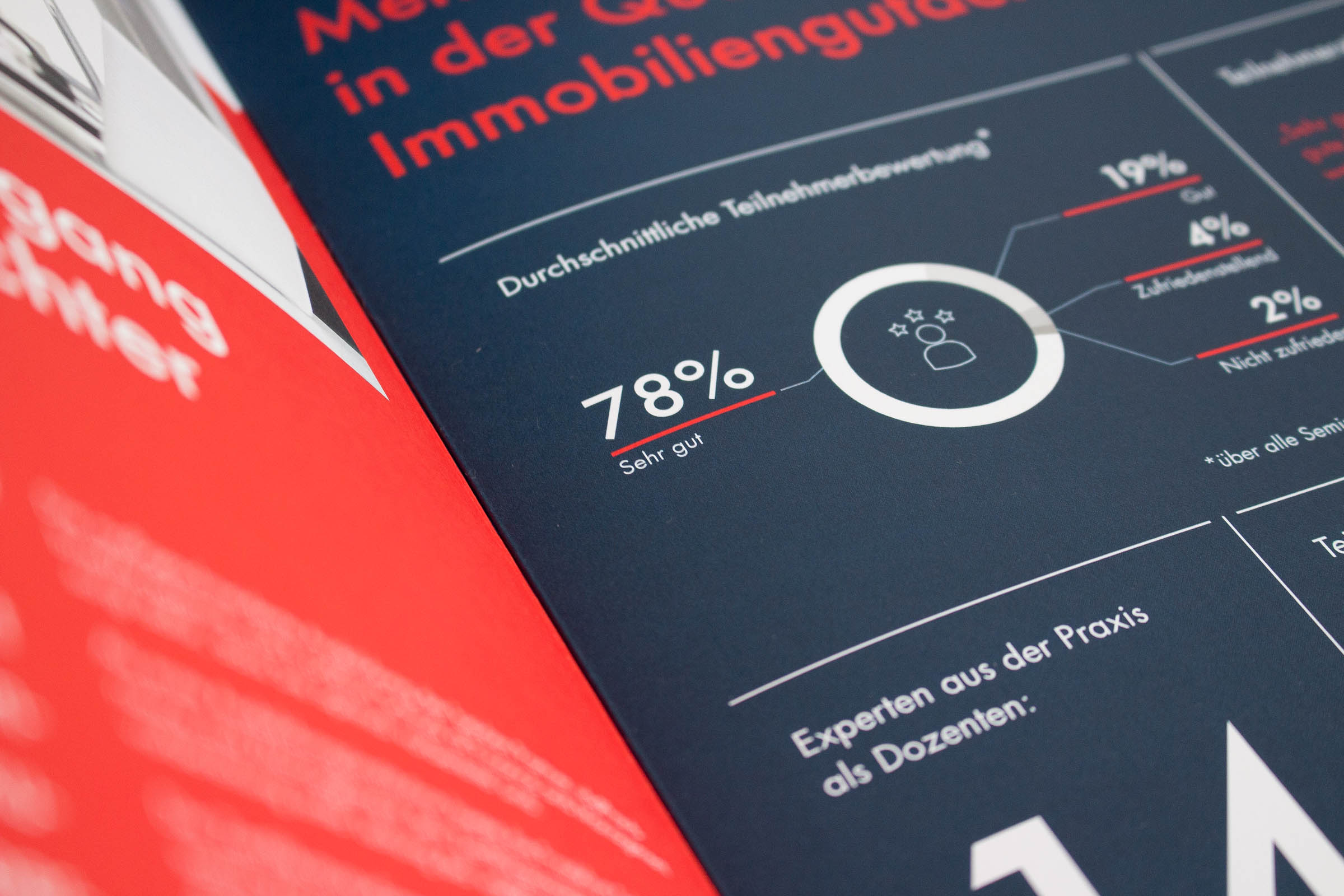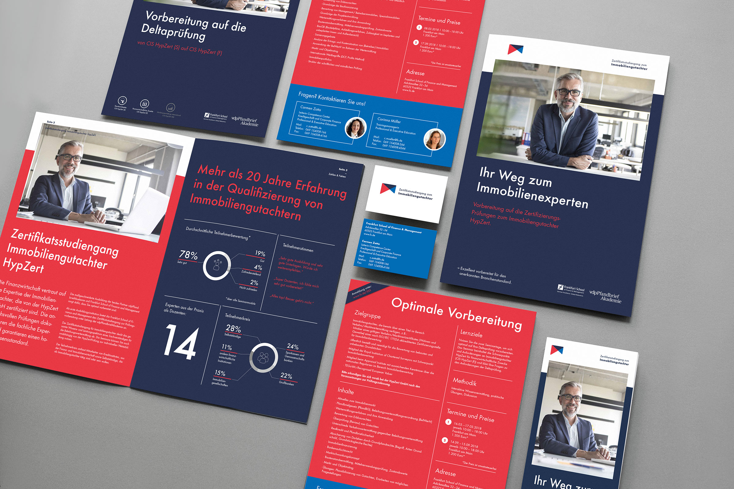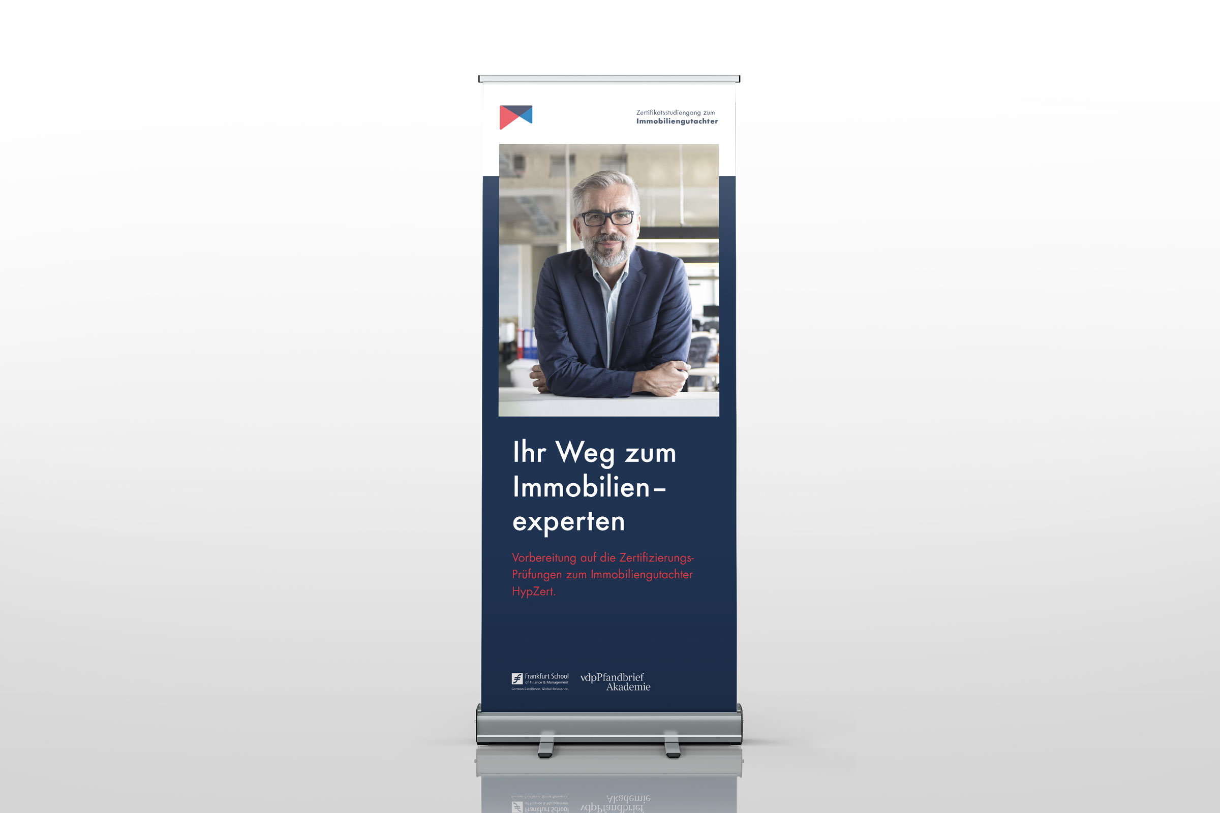 Für das Kooperationsprojekt der vdpPfandbriefAkademie, welche Seminare auf hohem fachlichem Niveau sowie Aus- und Weiterbildung für alle bietet, die in den Bereichen Immobilienbewertung, Immobilienfinanzierung und Immobilieninvestment im In- und Ausland aktiv sind und der Frankfurt School of Finance & Management, eine der führenden Business-Schools in Deutschland, sollten wir um den „Zertifikatsstudiengang zum Immobiliengutachter“ ein Corporate Design kreieren, das die Qualität des Produktes herausstellt und sich gleichzeitig von anderen Bildungsprodukten der beiden Unternehmen abhebt.